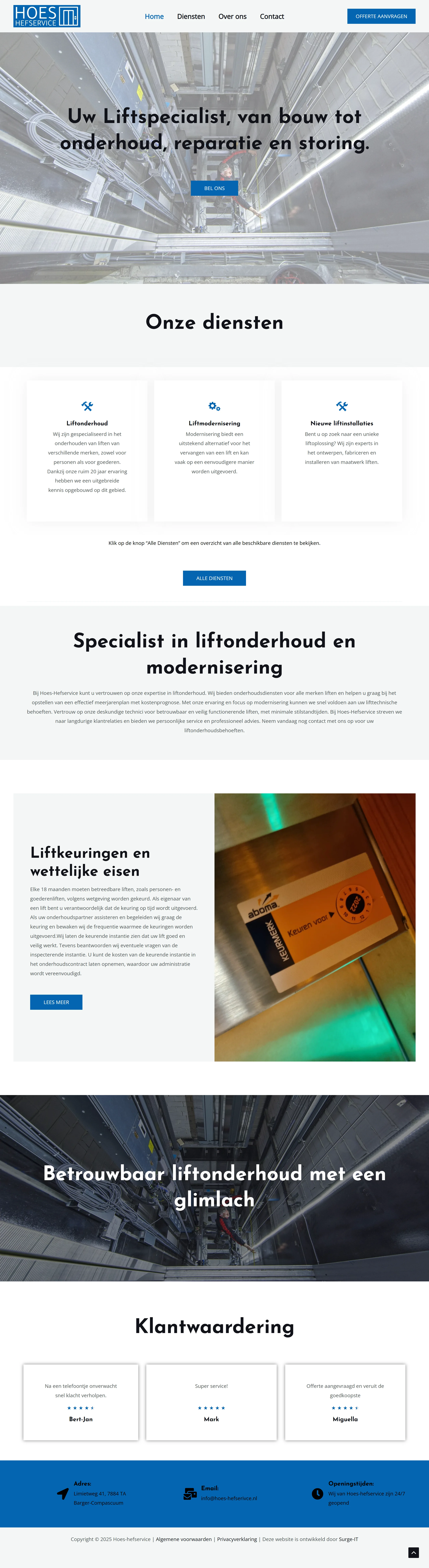 We ontwikkelden een eenvoudige, maar professionele website waarin de belangrijkste diensten van Hoes Hefservice centraal staan: onderhoud van liften, reparaties en storingsdiensten. De site is opgezet met de gebruiker in gedachten, gericht op bereikbaarheid en betrouwbaarheid, zonder overbodige opsmuk.