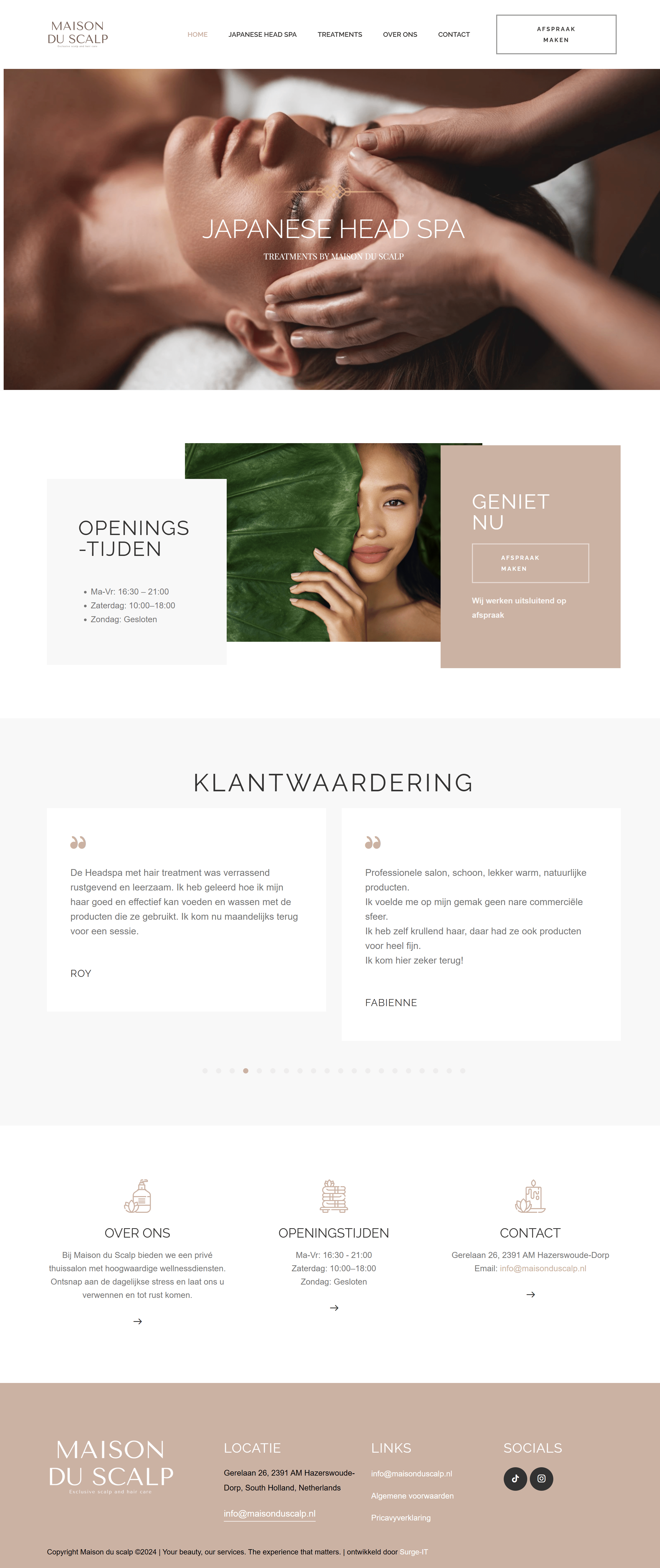 Maison du Scalp specialiseert zich in Japanse headspa-behandelingen en zet inmiddels de stap richting professioneel hoofdhuidspecialisme. De eigenaresse had zelf al een eerste website gebouwd met behulp van Canva, waarin haar passie duidelijk zichtbaar was. Toch miste het geheel structuur, snelheid en vooral de uitstraling die past bij haar vakgebied, waar vertrouwen, hygiëne en specialisatie centraal staan.